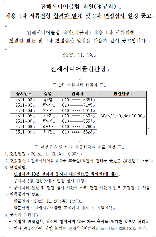 진해시니어클럽 정규직 채용 서류합격자 발표