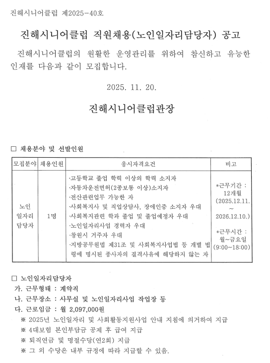 진해시니어클럽 직원(노인일자리담당자)채용 공고