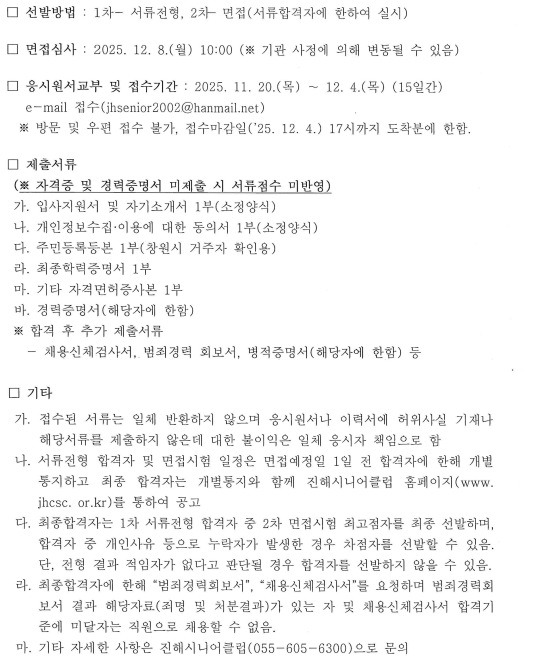 진해시니어클럽 노인일자리담당자 채용 서류합격자 발표