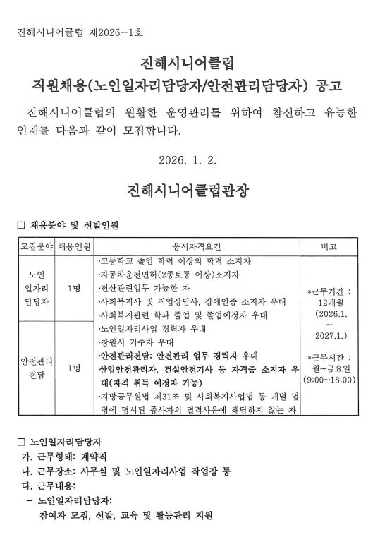 진해시니어클럽 직원채용(노인일자리담당자/안전관리담당자) 공고